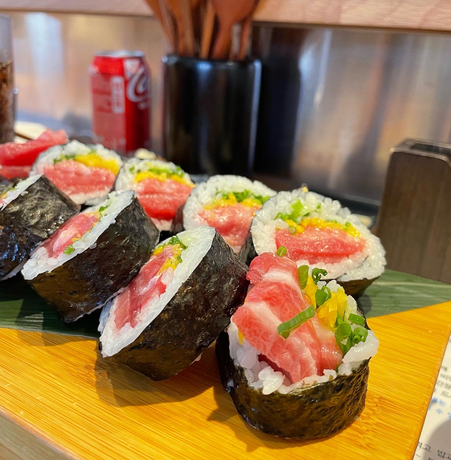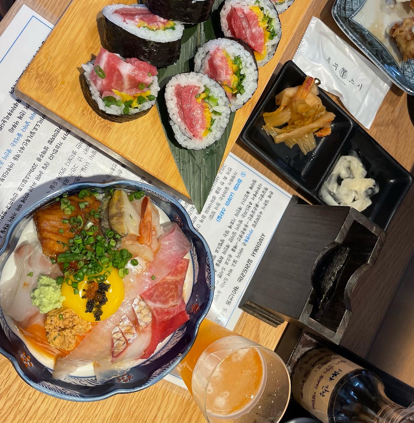 다음으로 시부야동과 삼덕마끼가 나왔는데요. 자리마다 맛있게 메뉴를 즐길 수 있는 방법이 나와있는데 한 번씩 읽어보고 드시는 것을 추천합니다. 촉촉한 밥알과 부드러운 회의 식감은 정말 최고였습니다. 한입 먹다보면 맥주가 바로 생각나는 맛입니다.